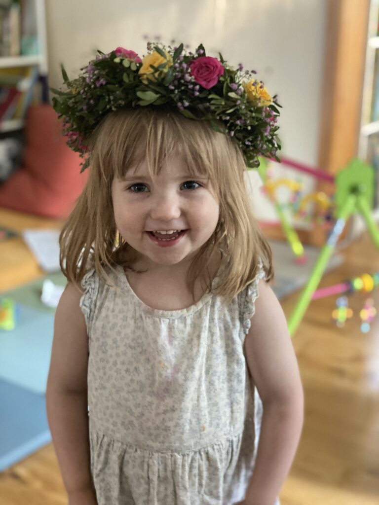 Die Kinder (und auch die Erwachsenen) tragen Blumenkränze im Haar.